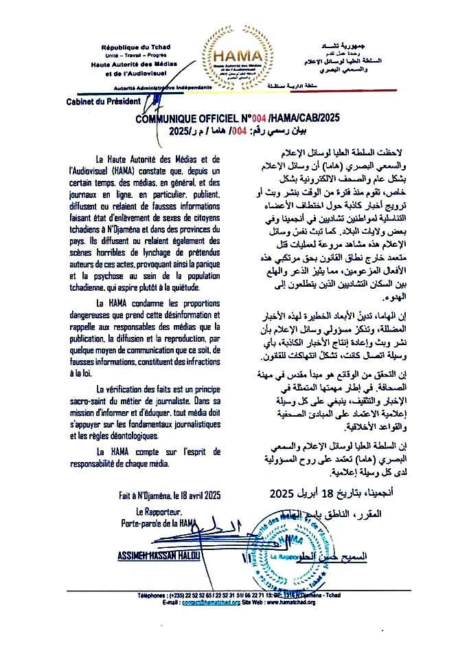 لاحظت السلطة العليا لوسائل الإعلام والسمعي البصري (هاما) أن وسائل الإعلام بشكل عام والصحف الالكترونية بشكل خاص، تقوم منذ فترة من الوقت بنشر وبث أو ترويج أخبار كاذبة حول اختطاف الأعضاء التناسلية لمواطنين تشاديين في أنجمينا وفي بعض ولايات البلاد. كما تبث نفس وسائل الإعلام هذه مشاهد مروعة لعمليات قتل متعمد خارج نطاق القانون بحق مرتكبي هذه الأفعال المزعومين، مما يثير الذعر والهلع بين السكان التشاديين الذين يتطلعون إلى الهدوء.