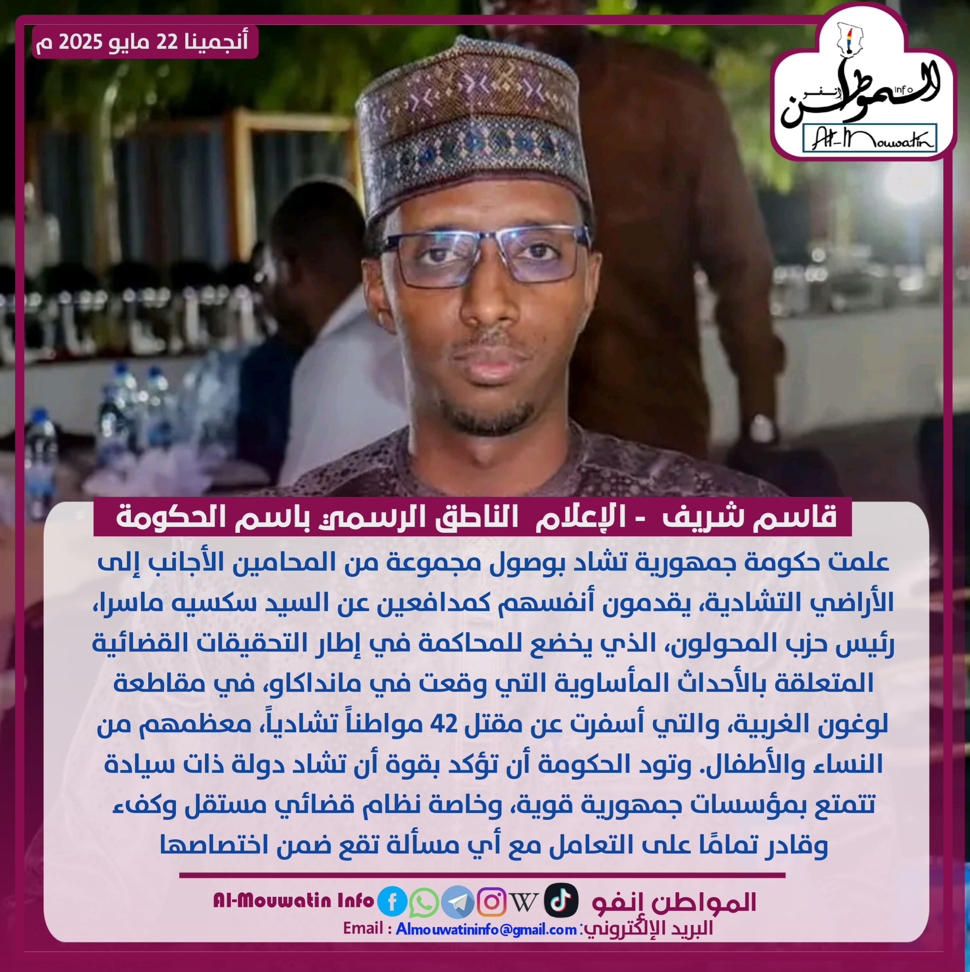 علمت حكومة جمهورية تشاد بوصول مجموعة من المحامين الأجانب إلى الأراضي التشادية، يقدمون أنفسهم كمدافعين عن السيد سكسيه ماسرا، رئيس حزب المحولون، الذي يخضع للمحاكمة في إطار التحقيقات القضائية المتعلقة بالأحداث المأساوية التي وقعت في مانداكاو، في مقاطعة لوغون الغربية، والتي أسفرت عن مقتل 42 مواطناً تشادياً، معظمهم من النساء والأطفال. وتود الحكومة أن تؤكد بقوة أن تشاد دولة ذات سيادة تتمتع بمؤسسات جمهورية قوية، وخاصة نظام قضائي مستقل وكفء وقادر تمامًا على التعامل مع أي مسألة تقع ضمن اختصاصها . لقد انتهى الوقت الذي كان فيه المحامون الأجانب قادرين، تحت ذرائع كاذبة، على التأثير أو إملاء مسار العدالة في دولنا الأفريقية. إن المحامين التشاديين المدربين وذوي الخبرة لا يحتاجون إلى أخذ دروس من أي شخص. ولذلك ترفض حكومة تشاد أي محاولة للتدخل الأجنبي في الشؤون الداخلية للبلاد، بأي شكل من الأشكال. وتطمئن الحكومة الشعب التشادي بأن الضوء الكامل سيظهر للأحداث التي شهدتها مانداكاو. وسوف يُحاسب الجناة والمتورطون والمتواطئون، أياً كانوا، على أفعالهم أمام المحاكم، مع الالتزام الصارم بالقانون وحقوق الدفاع.