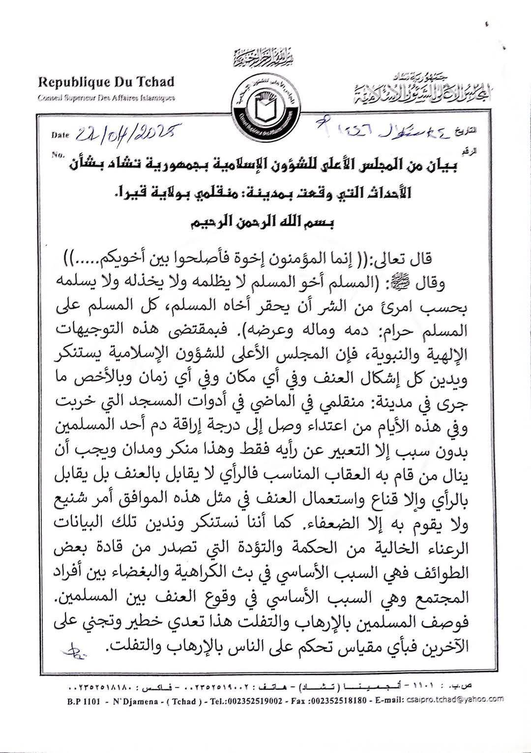 أمن دين#تشاد دين : المجلس الأعلى للشؤون الإسلامية بجمهورية تشاد يصدر بيانا بشأن الأحداث التي وقعت بمدينة منقلمي بولاية قيرا . almouwatin info6 أشهر ago6 أشهر ago01 mins تصفّح المقالات Previous: تشاد تصعيد التوتر بين الحزب الإصلاحي والحركة الوطنية للإنقاذ: صراع رؤى أم أزمة ديمقراطية؟..Next: داهمت الشرطة القضائية منازل المواطنين و هدمت مع أن قضيتهم لم تحسم بعد من القضاء التشادي اترك تعليقاً إلغاء الردلن يتم نشر عنوان بريدك الإلكتروني. الحقول الإلزامية مشار إليها بـ *التعليق * الاسم * البريد الإلكتروني * الموقع الإلكتروني احفظ اسمي، بريدي الإلكتروني، والموقع الإلكتروني في هذا المتصفح لاستخدامها المرة المقبلة في تعليقي.