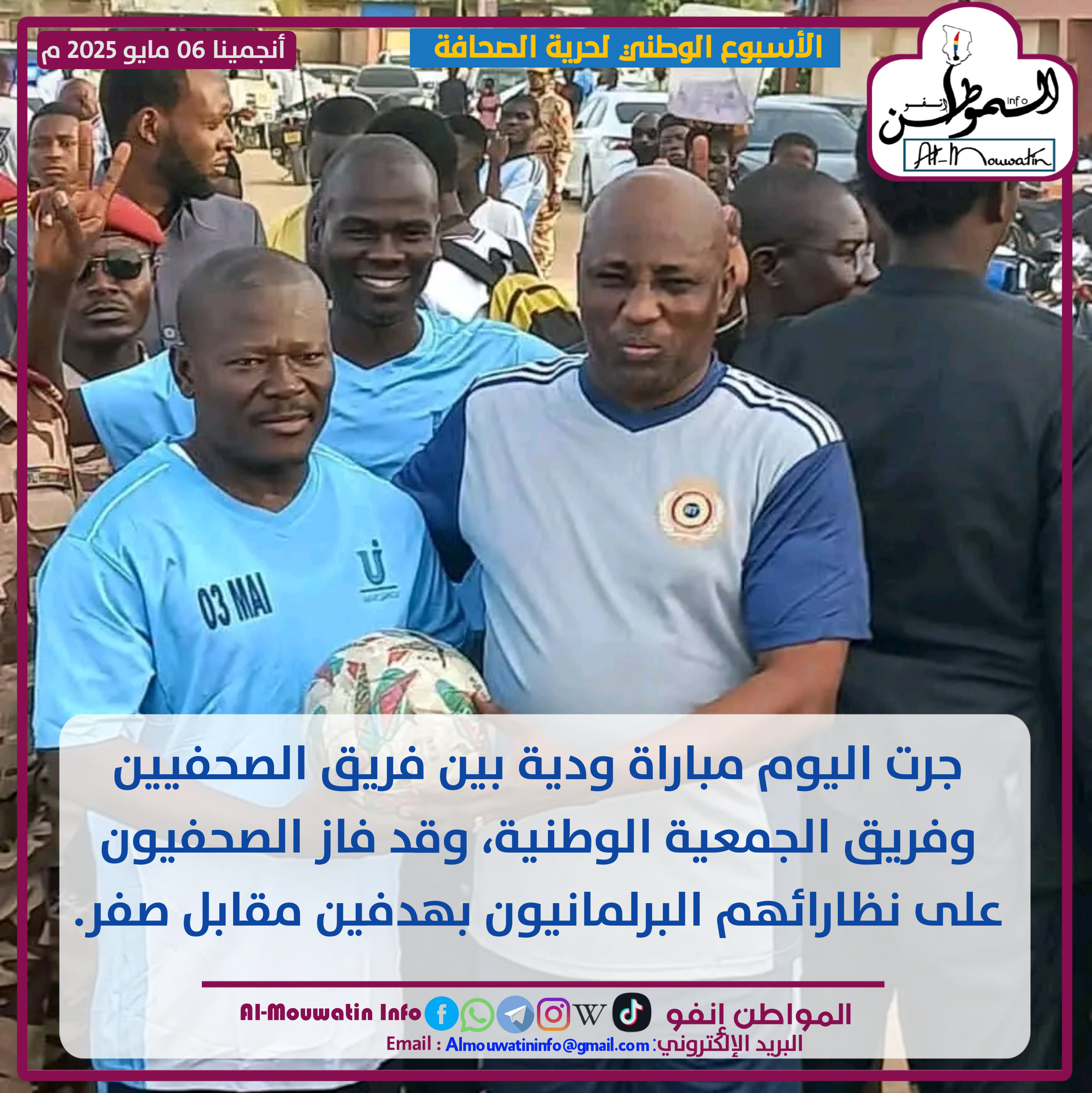 جرت مساء اليوم 06 مابو 2025م مباراة ودية بين فريق الصحفيين وفريق الجمعية الوطنية، وقد فاز الصحفيون على نُظارائِهم البرلمانيون بهدفين مقابل صفر.