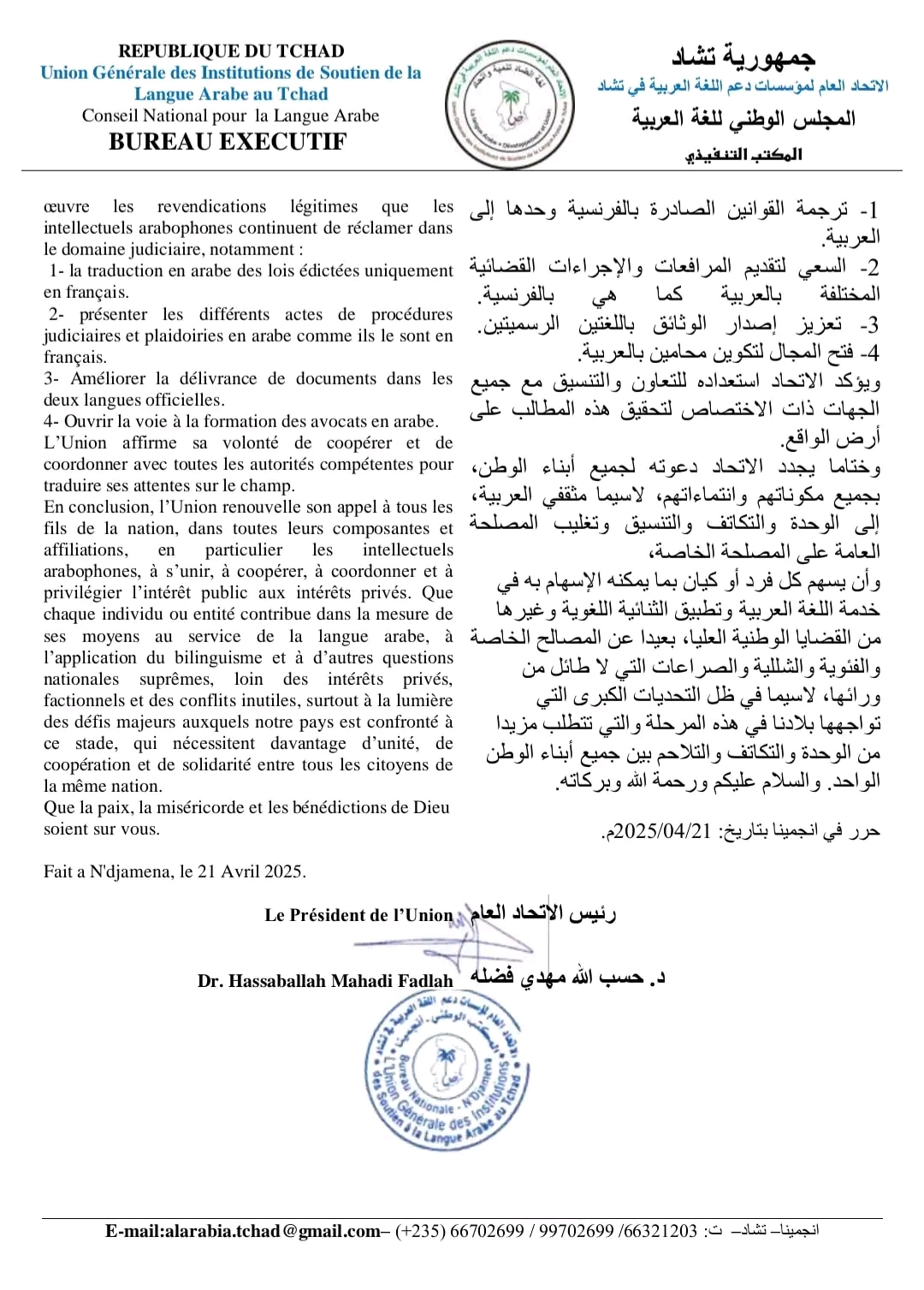 الاتحاد العام للمؤسسات دعم اللغة العربية في تشاد يقدم بيان صحفي يطالب فيه الحكومة بترجمة النصوص الصادرة من الحكومة إلى العربية