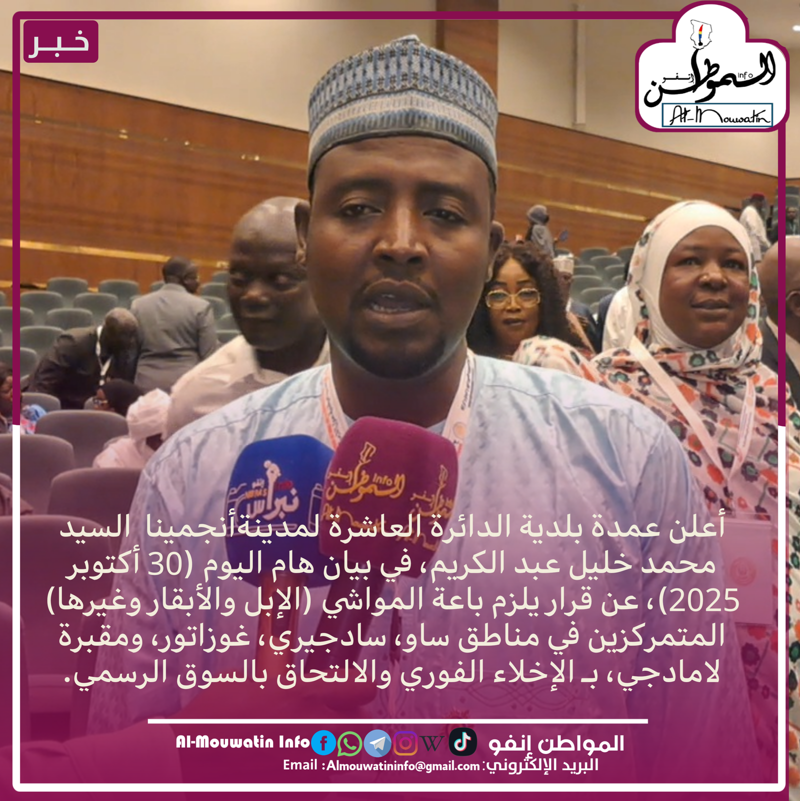أعلن عمدة بلدية الدائرة العاشرة لمدينة أنجمينا محمد خليل عبد الكريم، في بيان هام اليوم (30 أكتوبر 2025)، عن قرار يلزم باعة المواشي (الإبل والأبقار وغيرها) المتمركزين في مناطق ساو، سادجيري، غوزاتور، ومقبرة لامادجي، بـ الإخلاء الفوري والالتحاق بالسوق الرسمي.
