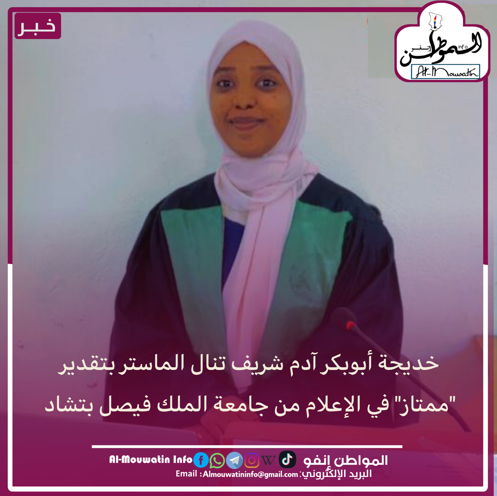 حققت الصحفية خديجة أبوبكر آدم شريف إنجازاً أكاديمياً كبيراً بحصولها على درجة الماستر 2 في تخصص الإذاعة والتلفزيون من جامعة الملك فيصل بتشاد. وتم منح الرسالة، التي ركزت على دمج الذكاء الاصطناعي في الإعلام الوطني، تقدير ممتاز، لتؤكد تفوقها وريادتها في مجال الصحافة والإعلام.